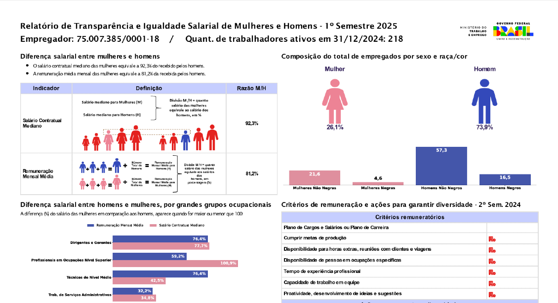 Em cumprimento à Lei da Igualdade Salarial (Lei nº 14.61/2023), que aborda a igualdade salarial e de critérios remuneratórios entre homens e mulheres no ambiente de trabalho.
